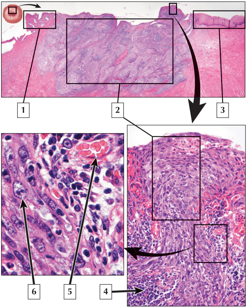 De todos los carcinomas de cuello uterino, el 80-90% son carcinomas epidermoides que aparecen en la zona de transformación, mientras que el 10-15% son adenocarcinomas que se originan a partir de las células glandulares superficiales. Después del análisis citológico, el diagnóstico se establece mediante colposcopia y biopsia. Un cambio precanceroso anómalo, conocido como neoplasia intraepitelial cervicouterina, puede progresar a una displasia intraepitelial escamosa, que puede convertirse en un carcinoma in situ o en un carcinoma infiltrante. Una vez que las células malignas atraviesan la lámina basal, se diseminan por el estroma del cuello uterino subyacente. Desde el punto de vista histológico, la neoplasia invasiva se caracteriza por nidos y lenguas infiltrantes de epitelio plano estratificado atípico, tanto queratinizado como no queratinizado. Los nidos o islas de células pueden ser irregulares o adoptar una forma angulada.