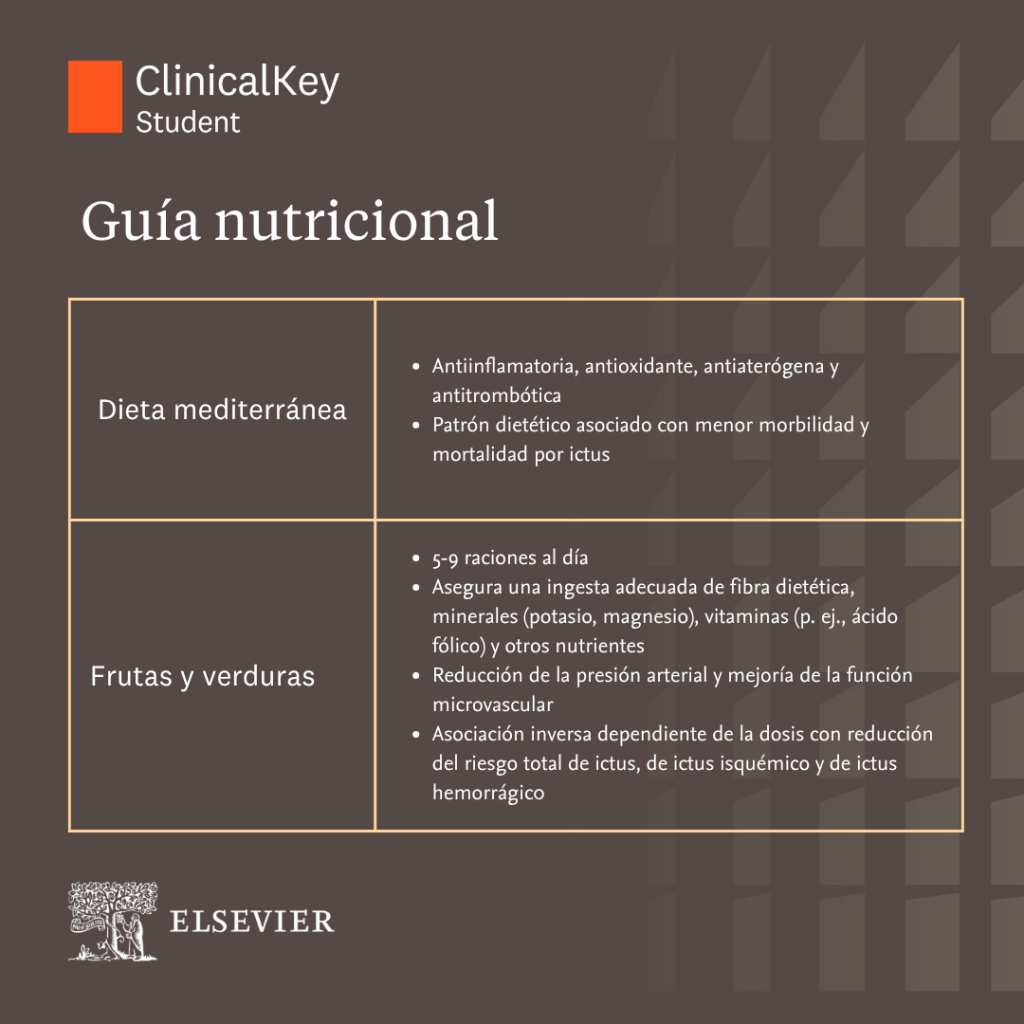 Se debe intentar mantener la salud global del paciente. Por ejemplo, los alimentos que sostienen la reparación celular y mejoran la respuesta de los marcadores inflamatorios son los frutos secos, los lácteos semidesnatados, los cereales integrales, y las frutas y verduras ricas en antioxidantes. En particular, en algunos estudios se ha demostrado que una dieta rica en ácidos grasos ω-3 tiene efecto protector frente al ictus, y las recomendaciones dietéticas actuales de comer pescado azul dos veces por semana ayudan a cubrir el objetivo de la ingesta de ω-3. Tenga en cuenta que los suplementos de ácidos grasos ω-3 no han demostrado el mismo beneficio y que están contraindicados en las personas que toman anticoagulantes o antiagregantes, como warfarina o ácido acetilsalicílico.