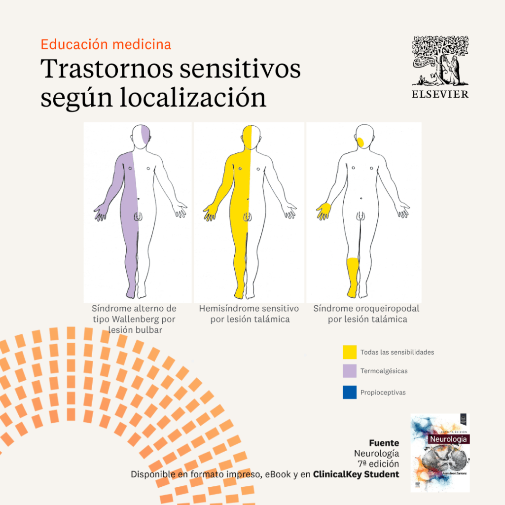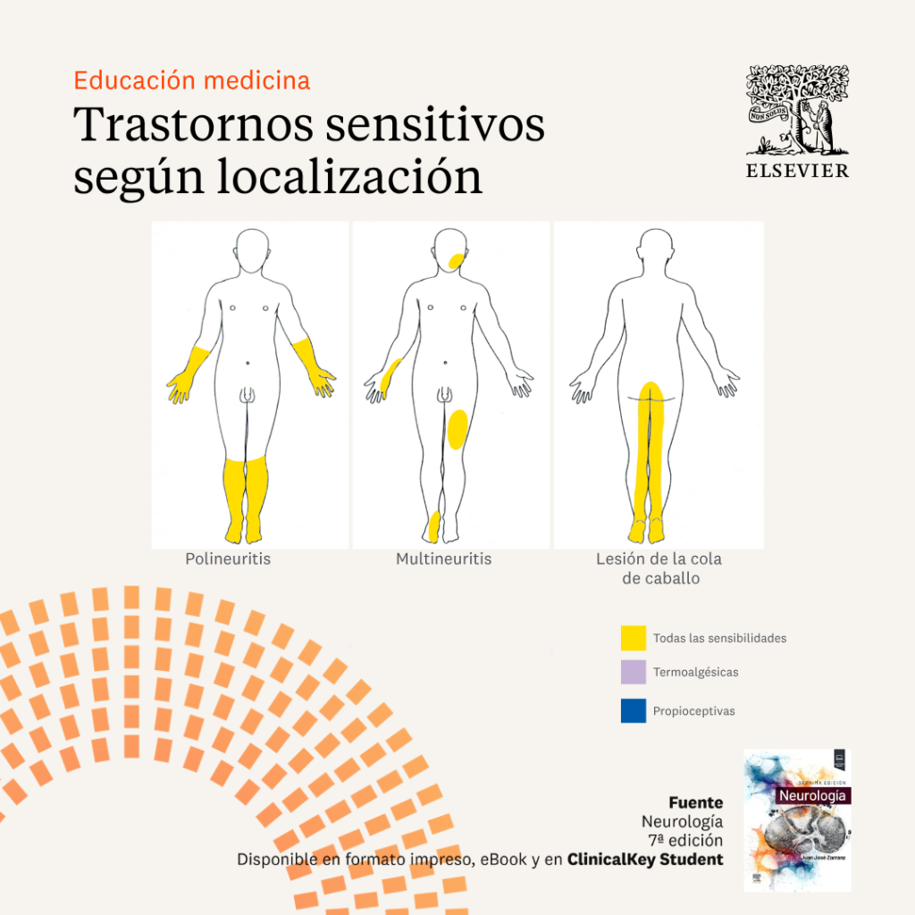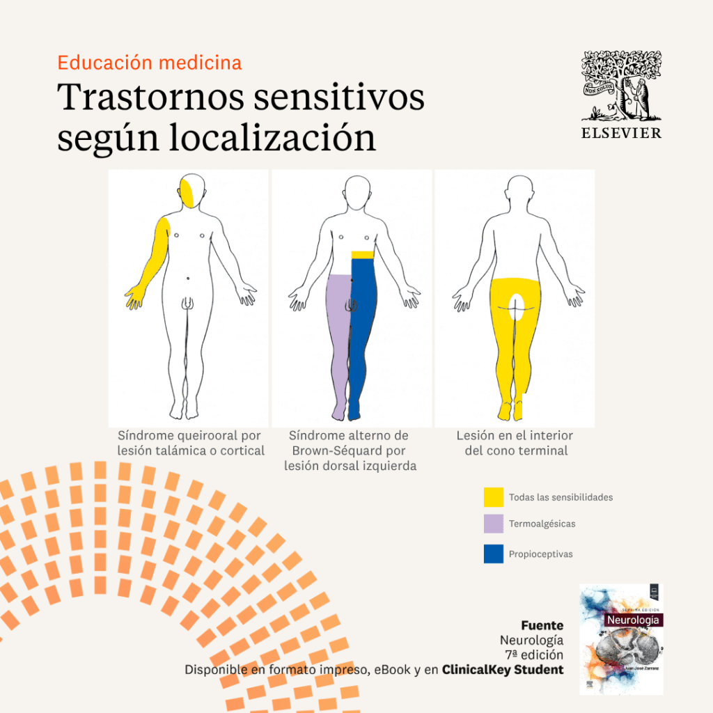 Infografías de los patrones de distribución y tipo de sensibilidad afectada en algunas de las lesiones más comunes de los sistemas nerviosos central y periférico. Los límites de los defectos están dibujados como nítidos, pero en realidad son difusos.