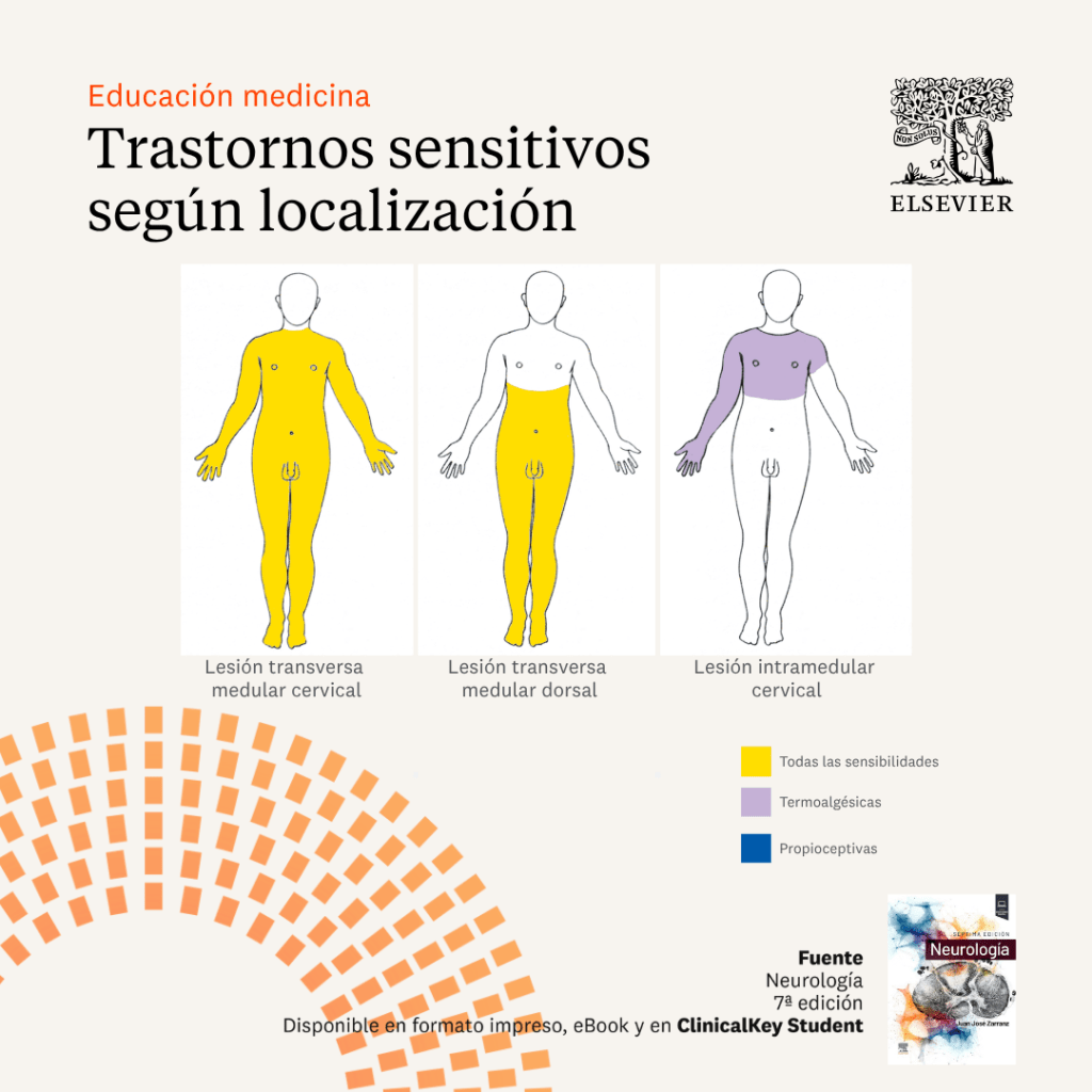 Los trastornos sensitivos más característicos según la localización de las lesiones se esquematizan en las siguientes infografías: