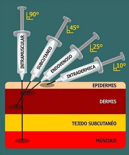 - Aplicación: introducir entre 1,5 ml y 2 ml. Las zonas más usadas para esta vía son la cara externa del brazo, cara anterior del muslo, tejido laxo del abdomen y la zona escapular de la espalda.