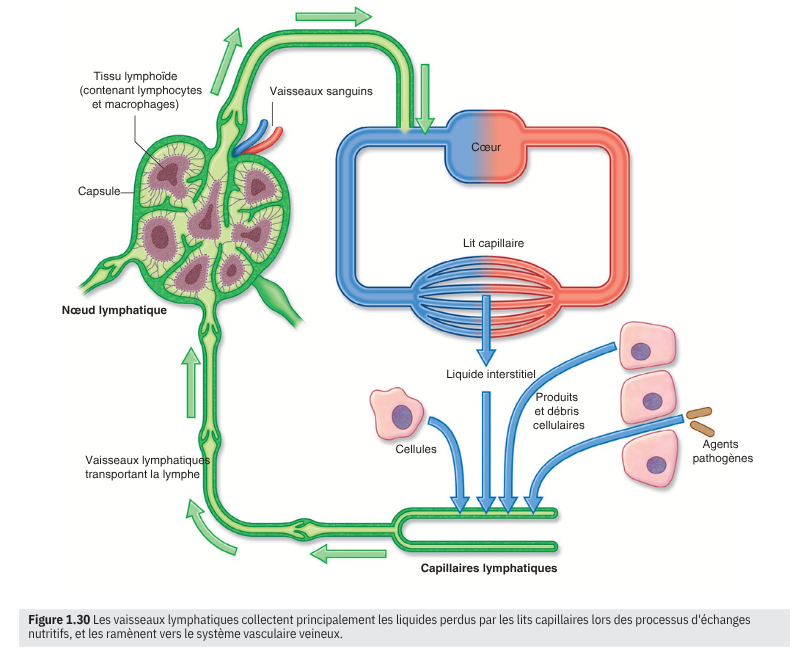 Les vaisseaux lymphatiques collectent principalement les liquides perdus par les lits capillaires lors des processus d’échanges nutritifs, et les ramènent vers le système vasculaire veineux (fig. 1.30). Des agents pathogènes, des cellules du système lymphatique, des produits et des débris cellulaires sont également contenus dans le liquide interstitiel qui se draine dans les capillaires lymphatiques.